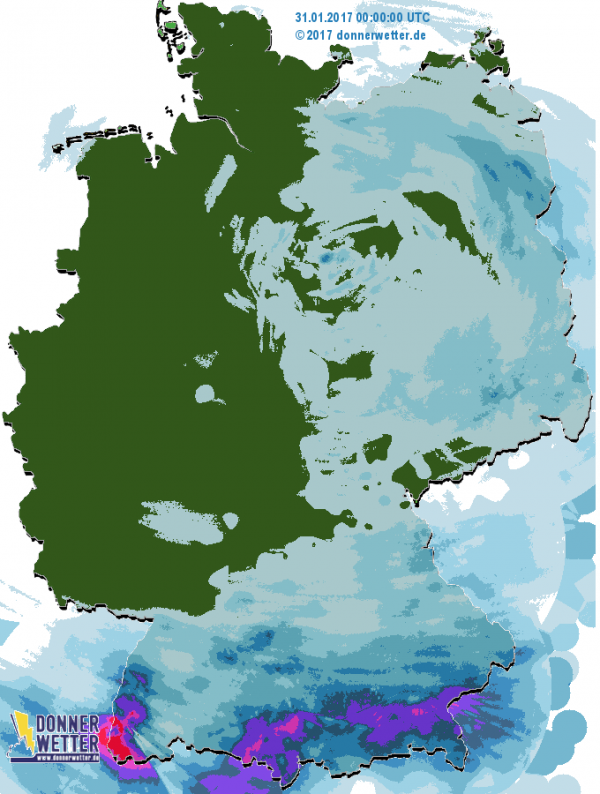 Das Tief über zieht langsam ab. Es hinterließ gestern an den Alpen 20-35 l/m2 Schnee und Regen. In Ostdeutschland gab es ebenfalls noch etwas Regen und Schnee, allerdings blieben die Mengen mit 1-5 l/m2 bescheiden. Heute bleibt es weitgehend trocken.