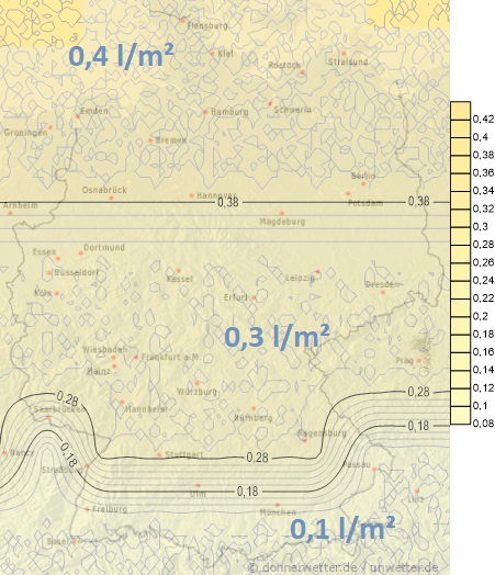 Am Donnerstag muss verbreitet mit Niederschlag gerechnet werden. Bei leichter Milderung geht dieser auch in Bayern zumindest in tieferen Lagen in Regen oder Sprühregen über. In den Bergen sollte es in der Regel noch bei Schneefall bleiben. Die Niederschlagsmengen liegen dabei zwischen 5 und 15 Liter pro Quadratmeter.