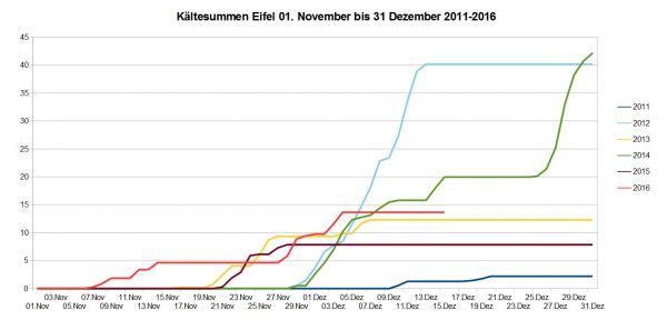 Ähnlich sieht die Lage in den Mittelgebirgen aus. Nach einem regelrechten "Frühstart" Anfang November ernährte sich die Kältesumme in den letzten Wochen nur mühsam. Aktuell stagniert sie seit knapp 2 Wochen bei rund 14 Grad, die Winter 2012 und 2014 sind längst vorbeigezogen.