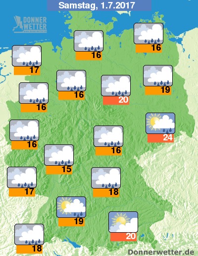 Das erste Juliwochenende kommt in weiten Landesteilen herbstlich daher. Am heutigen Samstag hält sich vielerorts dichte Bewölkung, dabei regnet es vor allem im Norden und Nordwesten teils ergiebig. Die Temperaturen erreichen nur maue 15 bis 20 Grad C.