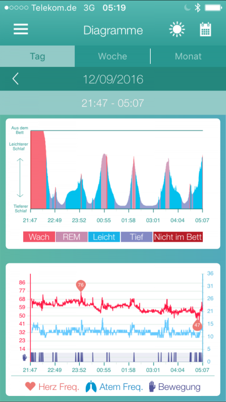 Die Oberfläche der App ist übersichtlich gestaltet und stellt grafisch unter anderem die in der Nacht aufgezeichneten Schlafphasen sowie den Verlauf von Herz-, Atem- und Bewegungsfrequenz dar. Die Diagramme können dabei in Tages-, Wochen-, oder Monatszyklen betrachtet werden.