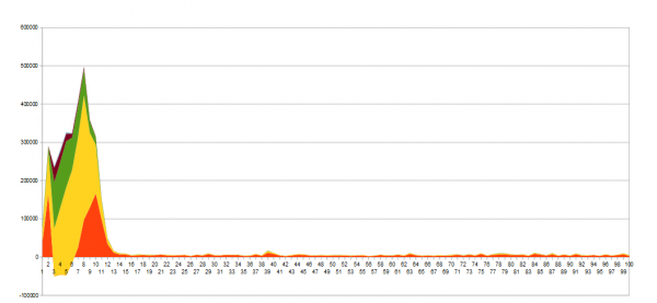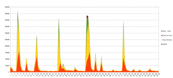 Die folgende Grafik zeigt den Verlauf der Messwerte während der ersten Messung. Farblich dargestellt sind die gemessenen Partikelgrößen: