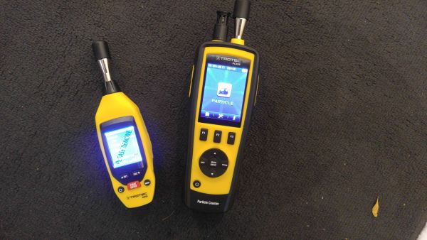 Die Intervallmessungen übernahm dieses Mal ein Partikelzählgerät von Trotec (rechts im Bild), welches über zwei Messzeiträume (vormittags / nachmittags) von jeweils drei Stunden Luftproben auswertete.