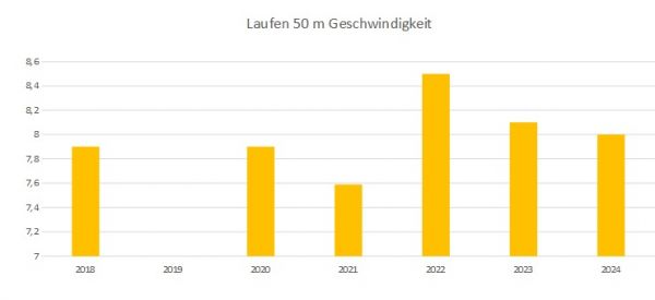 So dokumentiert etwa einer der donnerwetter.de-Mitarbeiter seine Leistungen in den Kategorien Sprint über 50 m und Weitsprung seit dem Jahr 2018 (s. Grafik).