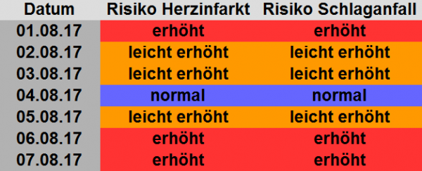 Die gewittrigen und vor allem in der Südhälfte auch schwül-heißen ersten Augusttage sorgen in dieser Woche für meist leicht erhöhte bis erhöhte Schlaganfall- und Herzinfarktrisiken.