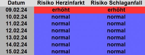 Die milden Temperaturen und der stabile Luftdruck sorgen in den nächsten Tagen für unauffällige Schlaganfall- und Herzinfarktrisiken.