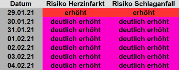 Die erheblichen Temperaturenschwankungen, die uns auch in den nächsten Tagen begleiten, sorgen bis weit in die kommende Woche hinein für deutlich erhöhte Risiken. Sowohl Schlaganfall- als auch Herzinfarktrisikopatienten sollten sich in den Tagen um den Monatswechsel herum unbedingt schonen.