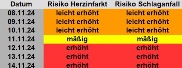 Die einströmende mildere Luft sorgt zum kommenden Wochenende für leicht erhöhte Schlaganfall- und Herzinfarktrisiken.