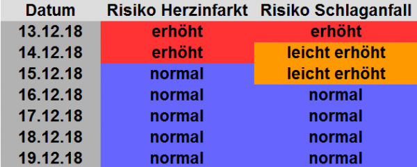 Unter Einfluss kalter Luft bewegen sich die Risiken für Schlaganfall- und Herzinfarktgefährdete in den nächsten Tagen auf erhöhtem Niveau. In der neuen Woche sinken die Gefahren mit milderer Luft wieder.