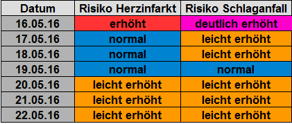 Nach den risikoträchtigen Pfingsttagen entspannt sich die Lage im weiteren Wochenverlauf ein wenig. Die Temperaturen legen wieder ein wenig zu, die Risiken für Schlaganfall- und Herzinfarktpatienten sinken parallel dazu.