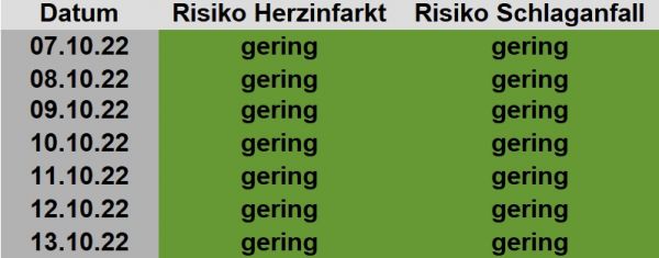 Freundliches und mildes Wetter bleibt uns auch über die nächsten Tage erhalten - die wetterbedingten Schlaganfall- und Herzinfarktrisiken sind insgesamt als gering einzuschätzen.