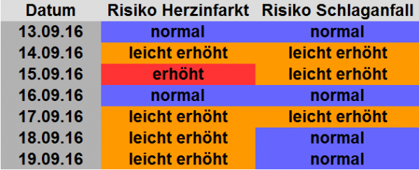 Vor allem der Übergang zu normalen Temperaturen am Donnerstag ist für Herz- / Kreislaufpatienten belastend. Am Wochenende sorgt dann die einfließende kühle Luft für zum Teil leicht erhöhte Risiken.