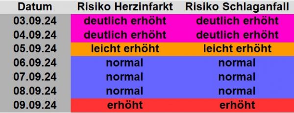 Der Wetterwechsel erhöht vor allem morgen und am Mittwoch die Risiken für Herzinfarkt- und Schlaganfallgefährdete. Die Restwoche verläuft weitgehend unproblematisch, bevor in der neuen Woche wieder mit einem Anstieg der Risiken zu rechnen ist.