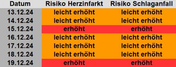 Mit dem Einfluss milderer Luft steigen die wetterbedingten Schlaganfall- und Herzinfarktrisiken vor allem am kommenden Sonntag an. Sonst liegen die Risiken meist im leicht erhöhten Bereich.