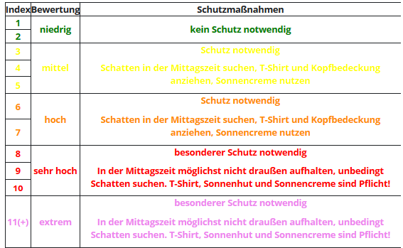 So sind beispielsweise bei einem Index von Faktor 7 in Norwegen die selben Schutzmaßnahmen zu beachten wie bei einer 7 in Südafrika.