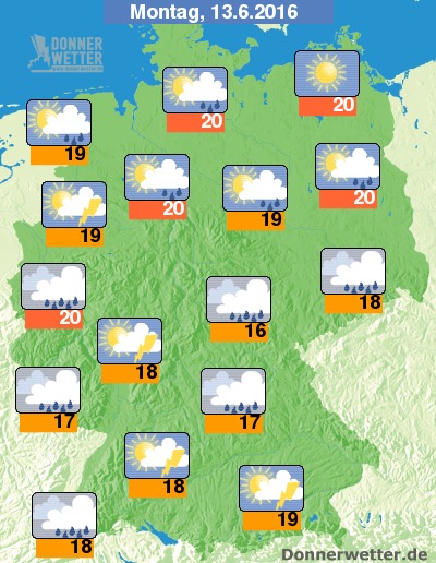 Vom äußersten Nordosten einmal abgesehen, starten wir hierzulande sehr wechselhaft in die neue Woche. Verbreitet sind am Montag Schauer zu erwarten, vor allem in der Südhälfte sind auch regionale Gewitter möglich (s. Karte links).