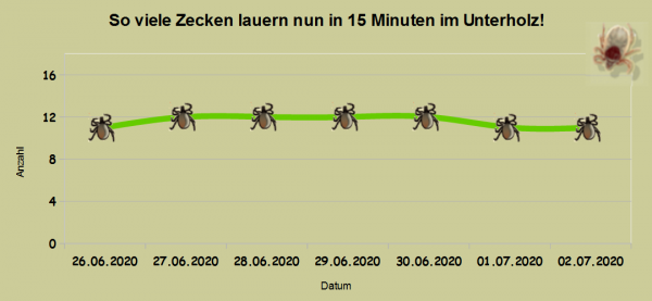 Die zunehmend feucht-gewittrige Witterung am Wochenende treibt die Zeckenzahlen in den kommenden Tagen in die Höhe - auf bis zu 12 Exemplare stoßen wir im Unterholz nun binnen 15 Minuten.