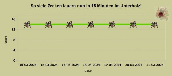 Mit einer Belastung von durchschnittlich 14 Zecken pro 15 Minuten ist in den nächsten Tagen im Unterholz zu rechnen - ein extrem hoher Wert für diese frühe Jahreszeit!