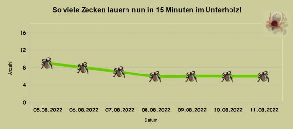 Die Feuchtigkeit hält sich im Unterholz also nur über einen sehr überschaubaren Zeitraum; dementsprechend niedrig sind jahreszeitlich gesehen auch die zu erwartenden Zeckenzahlen in den kommenden Tagen. Dennoch sollte bei Waldspaziergängen die Begegnung mit den blutsaugenden Parasiten mit eingeplant werden.