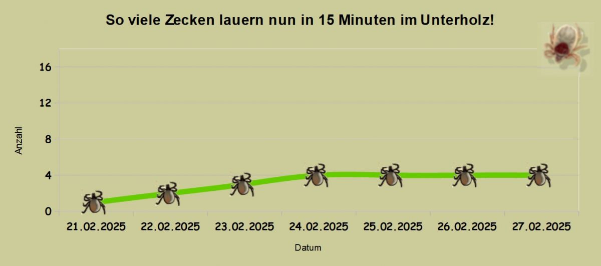 Begünstigt durch die Witterungsverhältnisse wächst bis Ende nächster Woche das Zeckenrisiko an. Zum Ende der kommenden Woche lassen sich bis zu vier Exemplare in 15 Minuten aufspüren.