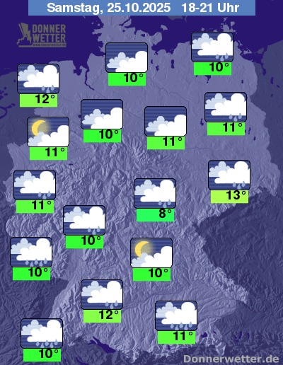 In der Nacht zum Sonntag lockert und klart der Himmel über der Nordhälfte verbreitet auf. Über der Südhälfte bleibt es meist bedeckt und hier fällt auch häufig Regen oder es bilden sich Schauer, sonst bleibt es meist trocken. Der Wind nimmt noch etwas zu und weht im Norden stark bis stürmisch, an der Nordsee mit Sturmböen. Weiter nach Süden hin weht der Wind oft stark. Die Temperatur sinkt auf 8 Grad am Oberrhein und bis 4 Grad im Vogtland.