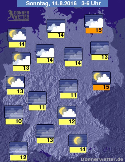 In der Nacht zum Sonntag ziehen über den Norden hier und da auch mal dichte Wolken hinweg, diese bringen jedoch keinen nennenswerten Regen. Vom Süden bis in die breite Landesmitte hinein zeigt sich der Nachthimmel verbreitet nur locker bewölkt oder sternenklar, dazu bleibt es trocken. Stellenweise bildet sich Nebel oder Dunst! Die Temperatur sinkt auf 15 Grad in Dresden und bis 10 Grad am Pfälzer Wald.