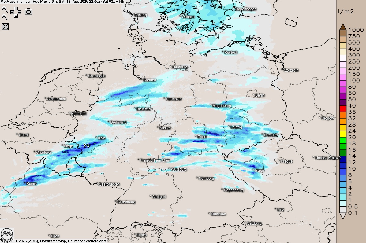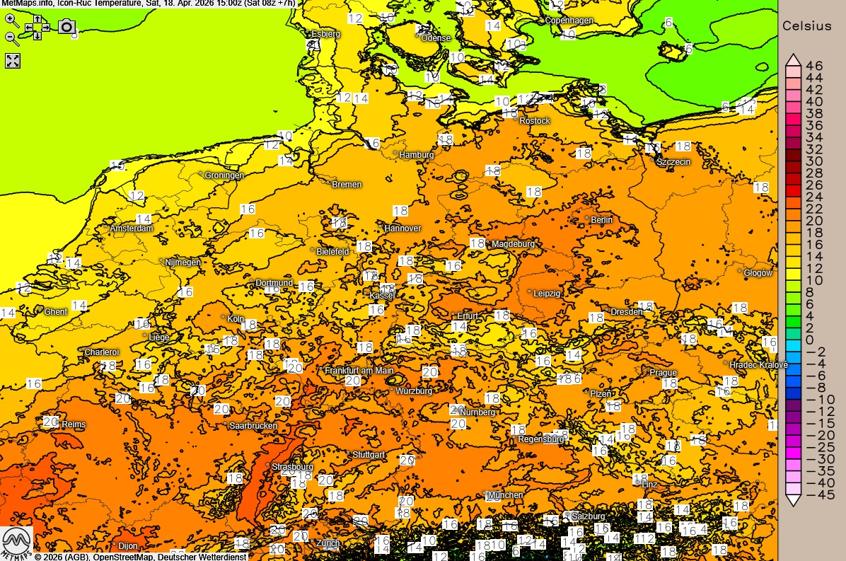 Die Lufttemperaturen um 15:00 Uhr, die Wetterkarte für 20:00 Uhr sowie die 6-Stunden-Regenmengen bis 22:00 Uhr nach ICON-RUC: