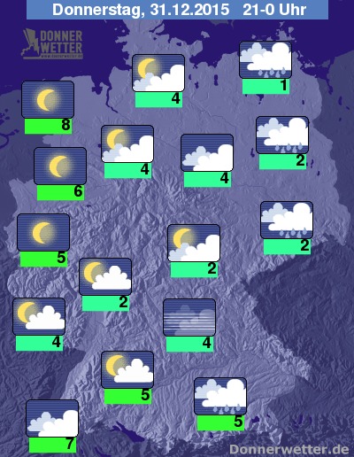 Im Westen, gegen Mitternacht auch im Südwesten und Nordwesten klart der Himmel verbreitet auf, weiter ostwärts ist es meist noch stark bewölkt oder trüb, jedoch ebenfalls trocken. Die Abendtemperatur liegt bei 8 Grad an der Nordseeküste und etwa 1 Grad in Vorpommern. An der Nordsee weht ein teils starker Wind.