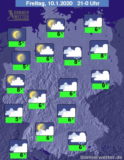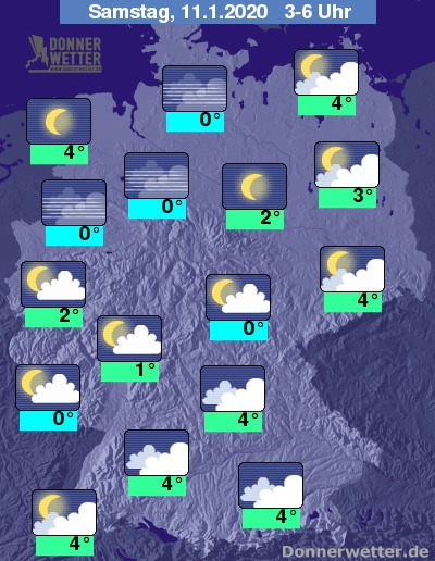 Während der zweiten Nachthälfte halten sich im Süden noch dichtere Wolken. Sonst präsentiert sich der Himmel wechselnd bewölkt. Gebietsweise kann man die Sterne für längere Zeit beobachten. Vom Niederrhein bis nach Schleswig-Holstein bildet sich stellenweise Nebel.