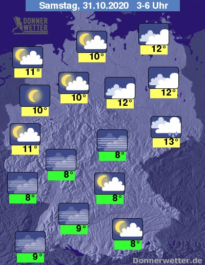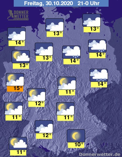 Bis Mitternacht zieht sich der Regen Richtung Sachsen und Brandenburg zurück. Sonst bleibt der Himmel im Norden weiterhin wolkenverhangen, in den anderen Gebieten lassen sich zumindest gelegentlich Mond und Sterne beobachten.