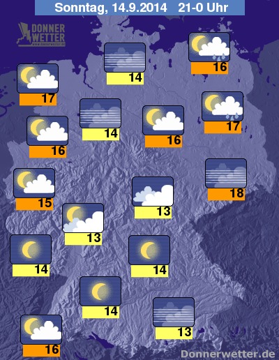 In der Nacht zum Montag ist es meist locker bewölkt oder sternenklar und es bleibt meist trocken. Es bildet sich stellenweise Nebel oder Dunst. Die Temperatur sinkt bis zum Morgen auf 15 Grad an der Müritz und etwa 10 Grad an der Schwäbischen Alb.