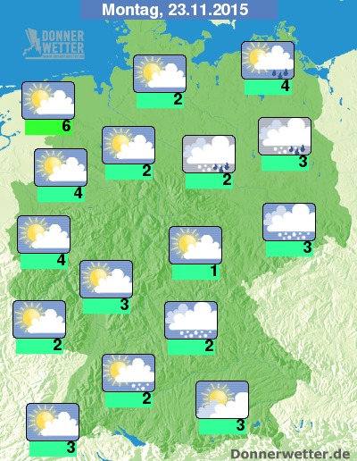 Am Montag zeigt sich über dem Norden und Westen verbreitet die Sonne und es ziehen hier meist nur lockere Wolken durch. Oft stark oder dicht bewölkt bleibt es hingegen über der Südosthälfte des Landes, hier fällt auch zeitweise Regen, Schneeregen oder Schnee mit entsprechenden Glättegefahren. Auflockerungen sind hier jedoch ebenfalls möglich. Die Temperatur steigt auf kalte 1 Grad im Leipziger Land und bis etwa 6 Grad in Emden.