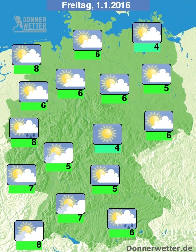 Am Neujahrstag fällt im Südosten unter dichten Wolken noch zeitweise Regen, teils auch Schneeregen oder Schnee mit entsprechender Glättegefahr! Sonst zeigt sich, neben meist nur lockeren oder aufgelockerten Wolken immer wieder die Sonne und es bleibt weitgehend trocken. Am Nachmittag ziehen ingesamt jedoch mehr und gebietsweise auch dichte Wolken durch. Die Temperatur steigt auf 4 Grad im Grabfeld und bis 8 Grad im Breisgau.
