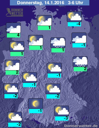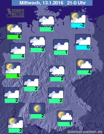 In der Nacht zum Donnerstag liegt zwischen dem Norden und Osten des Landes ein breites und dichtes Wolkenband, aus dem zeitweise Regen, Schneeregen oder Schnee fällt, dazu kann es verbreitet glatt werden! Weiter nach Südwesten hin zeigt sich der Himmel hingegen meist locker oder aufgelockert bewölkt, vor allem im Süden oft auch sternenklar, dazu bleibt es weitgehend trocken. Die Temperatur sinkt auf 4 Grad an der Nordseeküste und bis -4 Grad in Vorpommern.