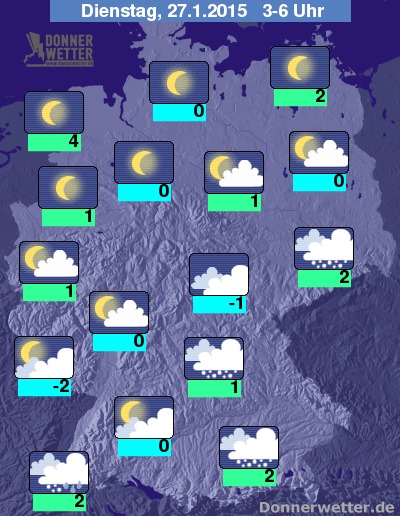 In der Nacht zum Dienstag klart der Himmel im Norden und Nordwesten Deutschlands verbreitet auf, auch weiter südöstlich werden die Auflockerungen zahlreicher und die Niederschläge klingen ab. Bis zum Morgen dicht bewölkt bleibt es jedoch im Süden, sowie in Sachsen und im südlichen Brandenburg, hier fällt zeitweise Schnee, zum Teil auch Schneeregen. Dabei kann es gefährlich glatt werden. Die Temperatur sinkt auf 4 Grad in Wilhelmshaven und -2 Grad am Pfälzer Wald.