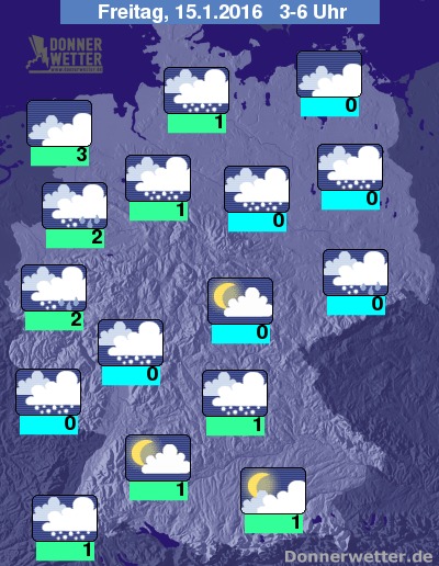 In der kommenden Nacht ziehen häufig dichte Wolken übers Land, die für zeitweilige Schneefälle sorgen, im Nordwesten und Westen fällt zum Teil auch Regen oder Schneeregen. Vor allem über dem Süden und der Landesmitte lockert die Bewölkung auch gebietsweise auf. Es besteht verbreitet Glättegefahr durch Schnee und überfrierende Nässe! Die Temperatur sinkt auf 3 Grad an der Nordseeküste und bis 0 Grad in Dresden und Leipzig. Über der Südwesthälfte des Landes weht ein starker und teils auch stürmischer Wind.