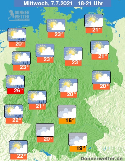 Am Donnerstag ist es im Land aufgelockert bis stark bewölkt, im Nordosten und Osten bleibt es dabei zumeist trocken, während sich sonst gebietsweise Schauer bilden. Bei Werten von 21 Grad an den Küsten und bis 25 Grad in Oberbayern sind auch örtliche Gewitter möglich.