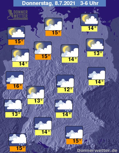 In der Nacht zum Donnerstag ist der Himmel über dem Süden weitgehend bedeckt und es können sich hier einzelne Schauer bilden. Im übrigen Land ist es locker bis aufgelockert bewölkt. Vor allem im Norden zeigt sich der Himmel auch sternenklar. Dazu bleibt es trocken und die Werte sinken auf 16 Grad in Köln und bis 12 Grad in Jena.