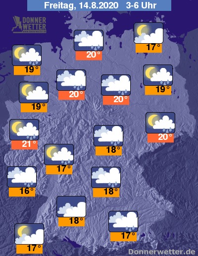 Bis Mitternacht bleibt es teils stärker bewölkt, teils klar. Gebietsweise gehen erfrischende Regengüsse und Gewitter nieder.