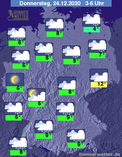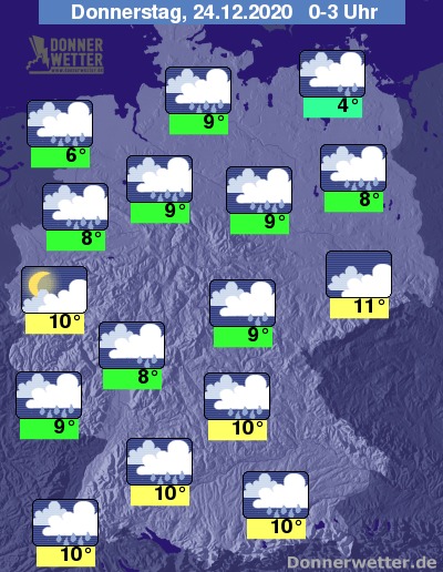 Während der zweiten Nachthälfte regnet oder nieselt es munter weiter. Nur in einem Streifen über der Landesmitte trocknet die Luft im weiteren Verlauf ab und die Wolkendecke reißt teilweise auf.