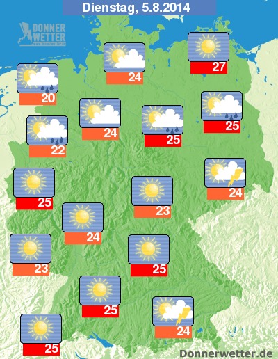 Am Dienstag wird es vor allem in der breiten Mitte bis in den Süden verbreitet freundlich und trocken. Im Norden ist es zeitweise ebenfalls freundlich, jedoch können sich besonders am Nachmittag zeitweise Schauer und Gewitter bilden. Am Alpenrand sind ebenfalls einzelne Schauer und Gewitter möglich.