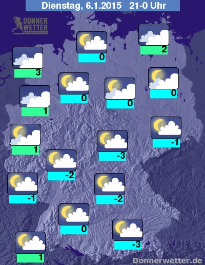 Heute Abend nehmen die Wolkenanteile insgesamt etwas zu, jedoch ist es weiterhin oft noch aufgelockert bewölkt, vor allem im Norden, Nordwesten und Westen des Landes zieht sich der Himmel aber oft schon zu, dabei bleibt es aber noch weitgehend trocken. Die Abendtemperatur liegt bei 3 Grad an der Wesermündung und um -3 Grad am Starnberger See.