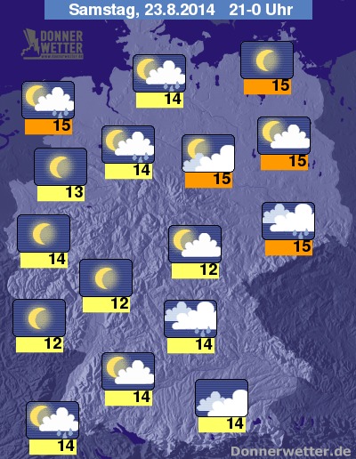 Am Abend reißt der Himmel nach Westen hin schon wieder auf und die Schauer klingen nach und nach ab, weiter nach Osten sind aber da und dort noch Schauer unterwegs, hier bleibt es vorerst meist stark, teils auch aufgelockert bewölkt. Die Abendwerte liegen zwischen rund 15 Grad in Berlin-Brandenburg und kühlen 12 Grad im Taunus.