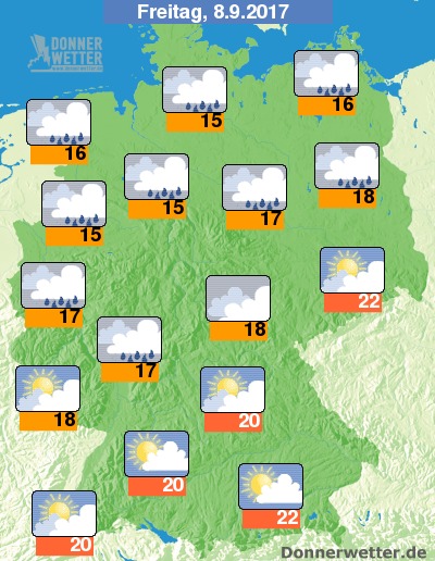 Die Temperaturen erreichen im Regen herbstliche 15 bis 18 Grad C, im Süden bis 22 Grad C.