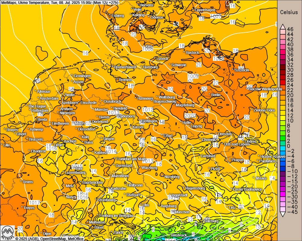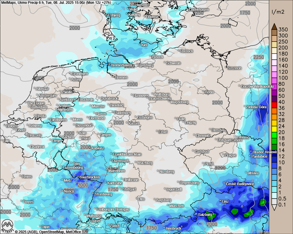 Die Karten bilden die Lufttemperaturen am Dienstagnachmittag (15:00 Uhr) sowie die 6-Stunden-Regenmengen bis 15:00 Uhr ab (UKMO):