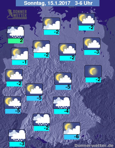 In der bevorstehenden Nacht ziehen über den Süden und im weiteren Verlauf auch über den Nordwesten und Norden dichte Wolken mit Schneefällen hinweg. Es besteht Glättegefahr! In den anderen Landesteilen bleibt es hingegen überwiegend locker bewölkt oder sternenklar und auch trocken. Die Tiefstwerte liegen bei 2 Grad an der Nordsee und bis -6 Grad in München.