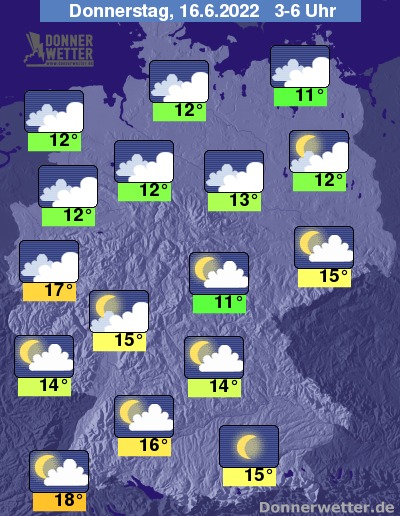 In der folgenden Nacht ist es anfangs noch überwiegend locker bewölkt oder sternenklar. Von Nordwesten her zieht sich der Himmel jedoch mehr und mehr zu, jedoch bleibt es überall trocken. Im Süden und Osten bleibt es bis zum Morgen noch bei lockerer bis aufgelockerter Bewölkung. Die Temperatur sinkt auf sehr milde 18 Grad in Freiburg und etwa 11 Grad in Neubrandenburg.