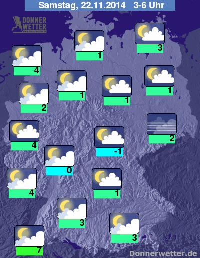 In der kommenden Nacht bleibt es bei lockerer bis aufgelockerter Bewölkung überall trocken. Besonders im Süden und Osten kann sich jedoch stellenweise Nebel oder Hochnebel bilden. Die Tiefstwerte liegen bei 7 Grad in Freiburg und etwa -1 Grad im Thüringer Becken.