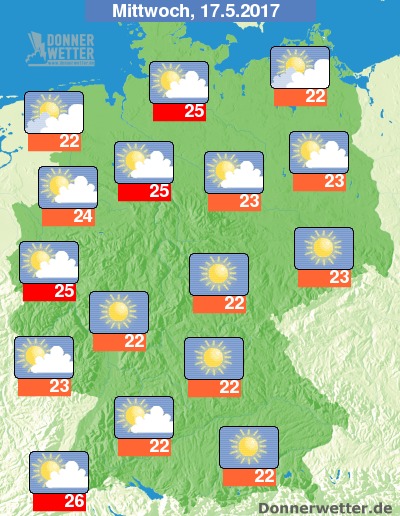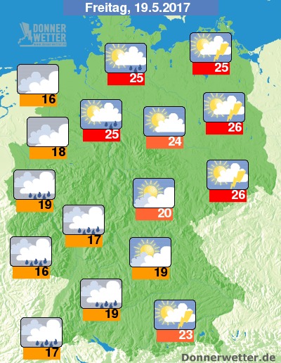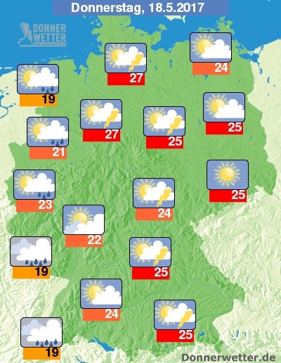 Am Donnerstag bleibt es zwar noch sehr warm, jedoch mischen sich örtlich kräftige Schauer und Gewitter mit möglichem Unwetterpotential ein. In Schauern kühlt es am Oberrhein bereits merklich ab, entlang der Weser werden nochmals schül-warme 27 Grad C erreicht.