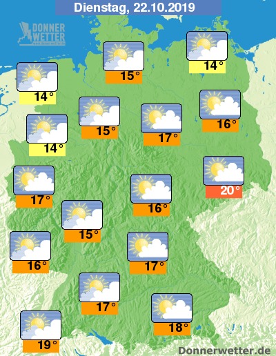 Die Höchsttemperaturen erreichen Werte zwischen 14 Grad im Nordwesten, sowie an den Küsten von Nord- und Ostsee und stellenweise 20 Grad im Osten und Süden.